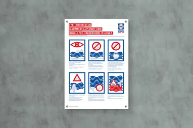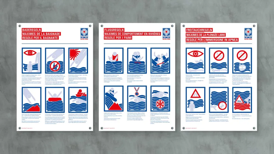 Im Zentrum stehen die sechs Baderegeln der SLRG, welche durch Fluss- und Tauchregeln ergänzt werden. Alle Verhaltenstipps werden laufend aktualisiert und den neusten Erkenntnissen im Bereich Wassersicherheit angepasst. Mit diesen lebenswichtigen Regeln, liesen sich der Grossteil der Unfälle verhindern.